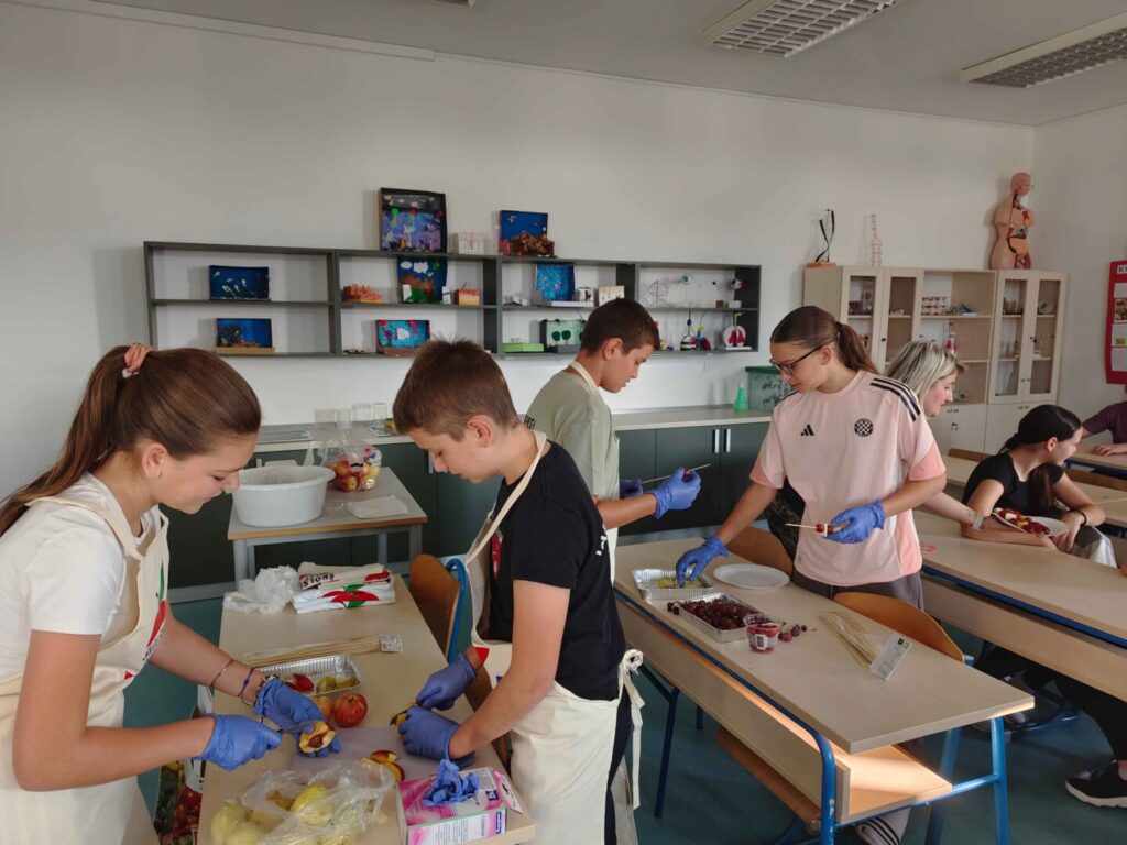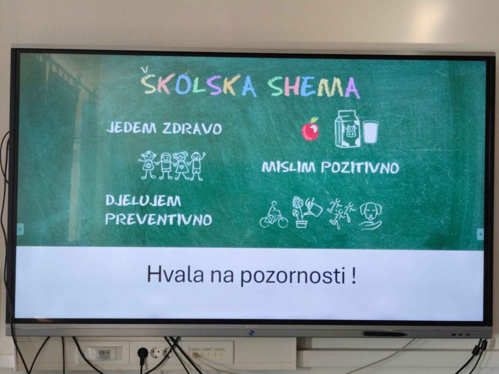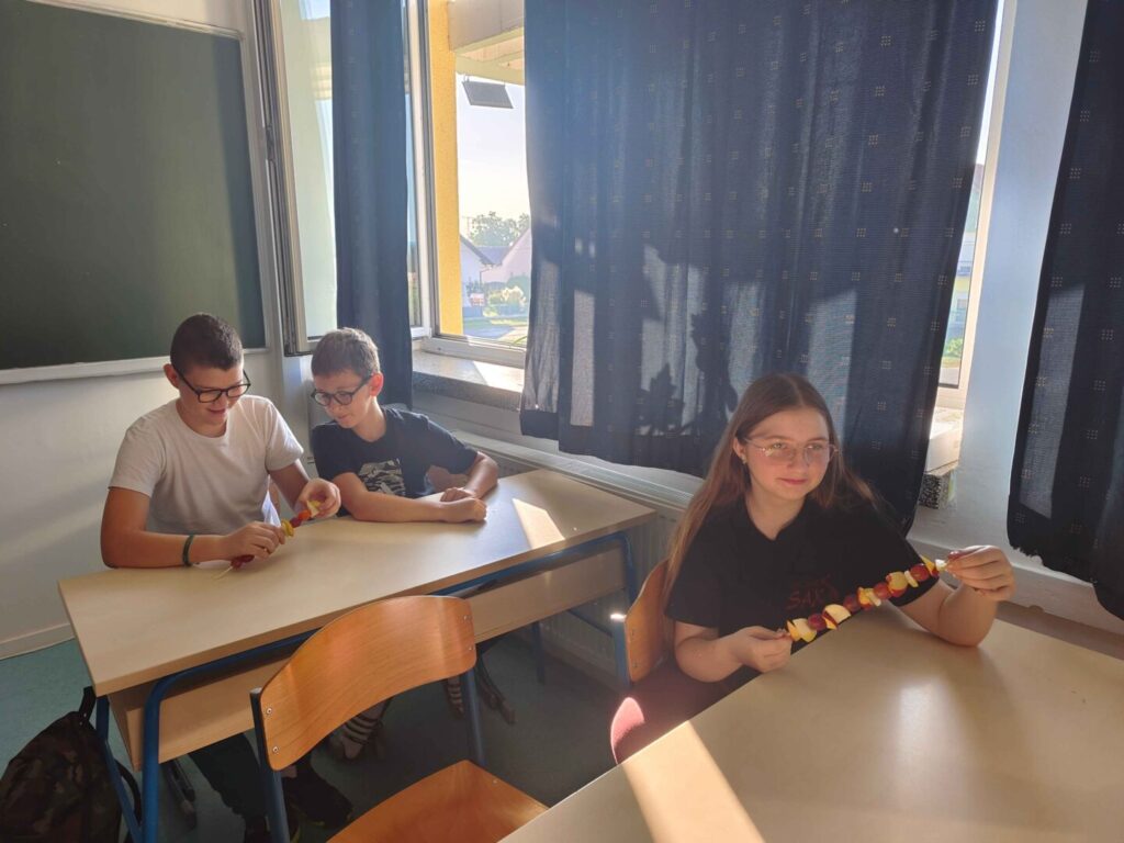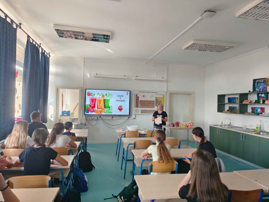 U okviru EU programa Školska shema, mjeri Distribucija voća i povrća te mlijeka i/ili mliječnih proizvoda, u kojoj sudjeluje naša škola, predavači DMD NATURALIS d.o.o. održali su 16. rujna 2025. učenicima 7.b razreda iz Usluga pratećih obrazovnih mjera – usluga organizacija satova kušanja voća i povrća i/ili mlijeka i mliječnih proizvoda te usluga edukacije učeničke populacije u okviru EU programa Školska shema, edukaciju putem Powerpoint prezentacije i kušanje voća.